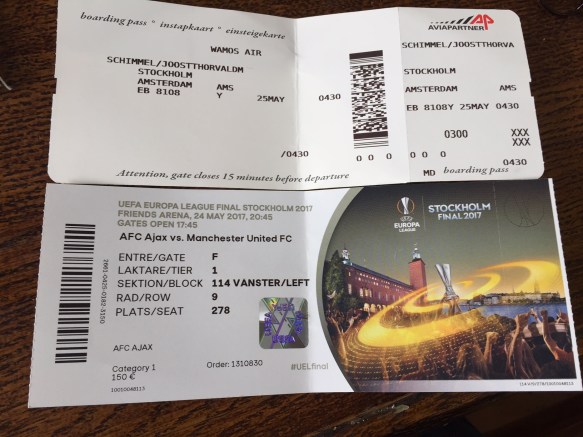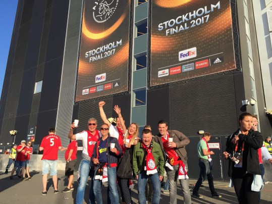 Door de non controle wilden er iets teveel mee. Zodoende bleven we nog een klein uurtje langer aan de grond. De sfeer in de kist veranderde hierdoor langzaam van uitgelaten naar geladen. Boos, geïrriteerd, kwaad, iedereen begon zich er mee te bemoeien, actief of passief. Rond twee uur eindelijk de deur dicht en trek in een borreltje. ‘No way José’ om in het jargon van die vermaledijde kut-trainer van United te blijven. Een broodje wat al drie maanden over tijd was, met een plakje serranoham, was alles. Oh ja ook nog een paar druppels ranja aangelengd met water. We maakten er intussen het beste van en hadden nog altijd hoop even in Stockholm op het plein een korte tijd sfeer te proeven en vooral wat in te drinken. Na landing snel de kist uit, bus in en rijden dan had het nog gekund. Maar helaas, kist bleef dicht zonder opgaaf van reden. Half uurtje, kon er ook nog wel bij. Temperatuur bij iedereen, en dan vooral bij Marcus inmiddels kookpunt bereikt. Wat een teringzooi, ongelofelijk. Voor de verandering weer even een bus in die midden op de luchthaven weer gewoon even twintig minuten bleef staan. Ach ja, wat kwamen we eigenlijk doen in Stockholm? Wij komen voor Ajax ja, wij komen voor de finale Europa League vanavond in jullie stad, ben je wakker probeerde iedereen met handen en voeten duidelijk te maken. Maar weinig sjoege, die chauffeur verstond ons toch niet of zat ook in het complot, zo dachten de meeste inmiddels. Na wat Zweeds gesmoes over een boardradio werden we uiteindelijk gedropt bij de Friends Arena. Geen plein, geen bier, geen gezang, geen lol, geen voorbereiding waar we ons zo veel van voorgesteld hadden. Na een prima burger met een bacootje, die we zelf op Schiphol al geregeld hadden dan maar naar onze plekken. Dat was indrukwekkend, mooi en alles wat je van een Europa cup finale mag verwachten. Maar ja dat is in het zicht van de camera’s en dan weten de bobo’s en de boefjes wel hoe ze zich moeten tonen aan de wereld.