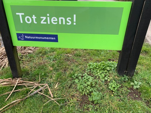 Ik verzucht dat dit het beste stukje ondergrond van de dag is. Kun je nagaan wat de rest was vandaag. Rechtsaf lopen we het prachtige natuurgebied Naardermeer uit. Ik maak nog een foto van het ‘tot ziens’ bord. Ik kom hier zeker nog vaak terug, zo mooi is het.