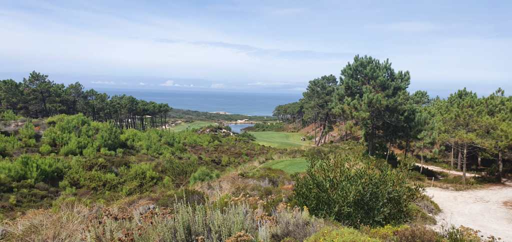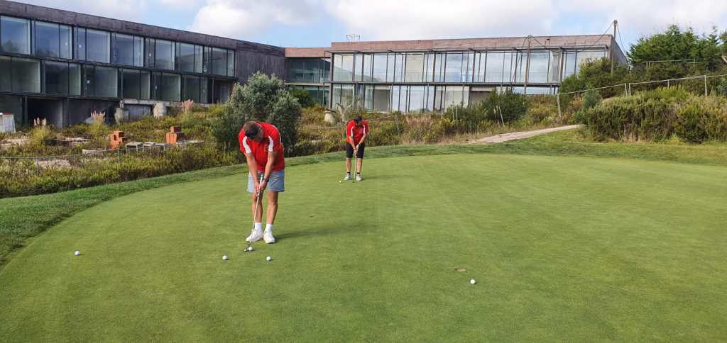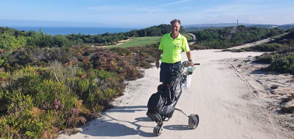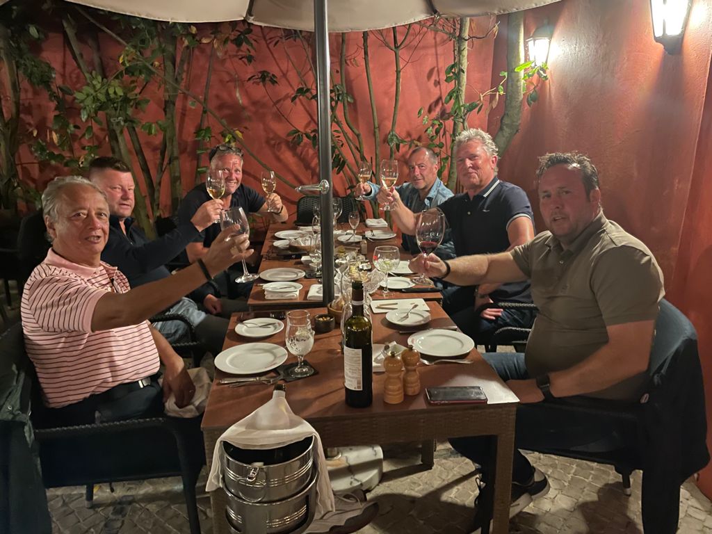 ‘Sjezus, jemig en wáááát, waren een paar van de reacties bij het zien van de foto en het verhaal. Bij het plaatsen van het bericht had Franc nog goede hoop toch mee te kunnen maar één dag voor vertrek meldde hij zich dan toch geblesseerd af. Toen waren er nog zes! Die zes stapten om klokslag zeven uur het TAP toestel op Schiphol in. Met een uurtje winst landde de TAP al om negen uur in Lissabon. Hup naar de Aeroporteparque, alwaar onze bus – eigendom van de familie Kramer – al ronkend klaar stond en we na wat kleine omzwervingen de route vonden richting het noorden. Geen tijd te verliezen en gelijk door naar de volgens kenners prachtige baan van Praia del Rey – voor een deel grenzend aan de Atlantische Oceaan. We werden niet teleurgesteld. Snel onze oogverblindend mooie nieuwe shirts uitgedeeld. Op het terras tijdens de stevige lunch voor onze ronde gaven we meer licht dan de brandaris op Terschelling ooit heeft gedaan, en ook op de baan zag je andere voorbijgaande golfers wel eens met de ogen knipperen.