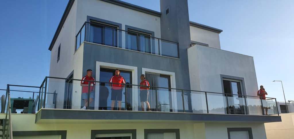 Aan een rustige avond waren de meeste hierna wel toe, dus op naar de supermercado, waar we twee minuten voor sluitingstijd binnenvielen en zo ongeveer al het overige aanwezige drank en voedsel inlaadde; honger en dorst!! Een heerlijke lange nacht lag voor ons, en dat was bij het zien van de slaapkamers – en dan vooral de bedden iets om verliefd naar uit te kijken. De volgende ochtend ‘tranquilo’ uit de veren voor de rode dag. De roze shirts voor deze dag ingeruild voor onze krap gesneden rode Torreveija 2019, op moving day. Op golfgebied lag alles na dag één nog open. Wil en Den stonden bovenaan en gingen ook deze dag samen de baan in. De baan van Bom Successo lag iets meer het binnenland en dat werd gemerkt gedurende de dag. Niet alleen de shirts waren deze dag rood maar ook de koppen. Het begon nog redelijk fris, maar gedurende de dag nam de warmte, de luchtvochtigheid en de vermoeidheid behoorlijk toe. Vooral bij de glooiende 2e negen was het op en af en was het best af en toe afzien. Maar ook deze baan – mijn inziens niet zo mooi als Praia del Rey – mag het predicaat topbaan best krijgen.
