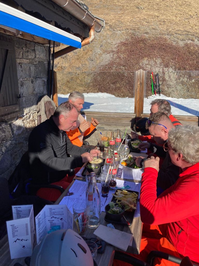 De maandag was de enige dag met wat wolken aan de hemel en zoals het ‘decadente ietwat roestige skiënde golden oldies’ betaamt hebben we toen ook wat minder kilometers gemaakt. Alle dagen hierna werd het alsmaar beter; het weer, de beentjes, de choco’s, de locaties, het eten, wat een feest, én wat hebben we genoten en gelachen!!!