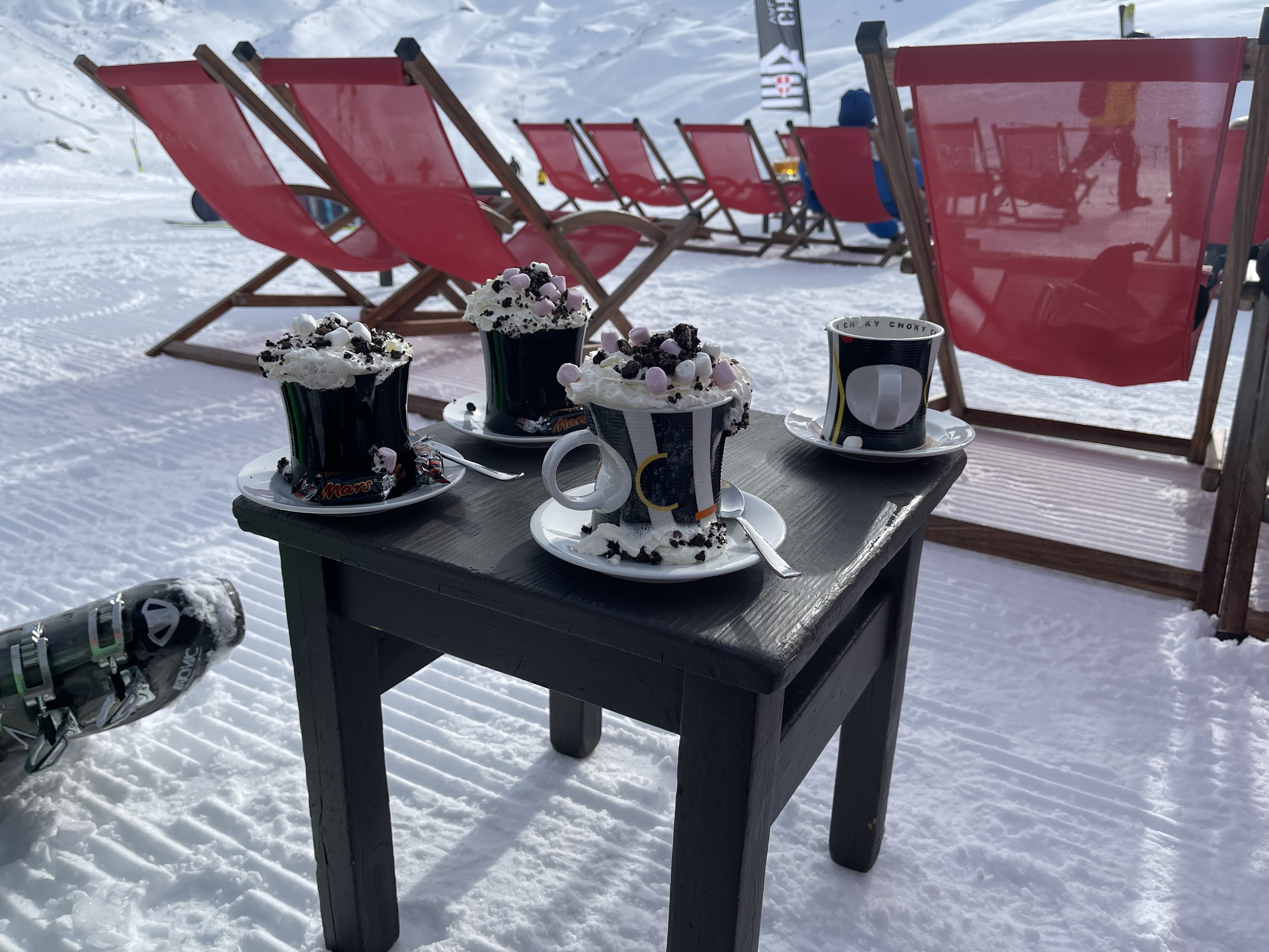 Die heerlijke decadentie kwam tijdens onze eerste stop al schrijnend aan het licht. Zesmaal een overigens heerlijke instant choco met slagroom – en een beschuitje met bevroren aardbeien kosten ons het lieve sommetje van €. 150,-. ,,Ach wat kan het kosten, we zijn er ff uit,” zo redeneerden we toen we onze ski’s weer lachend onderbonden, en weer glijdend verdwenen in de witte schoonheid van Lès Trois Valleés.