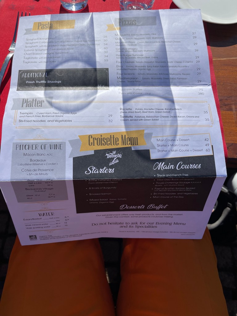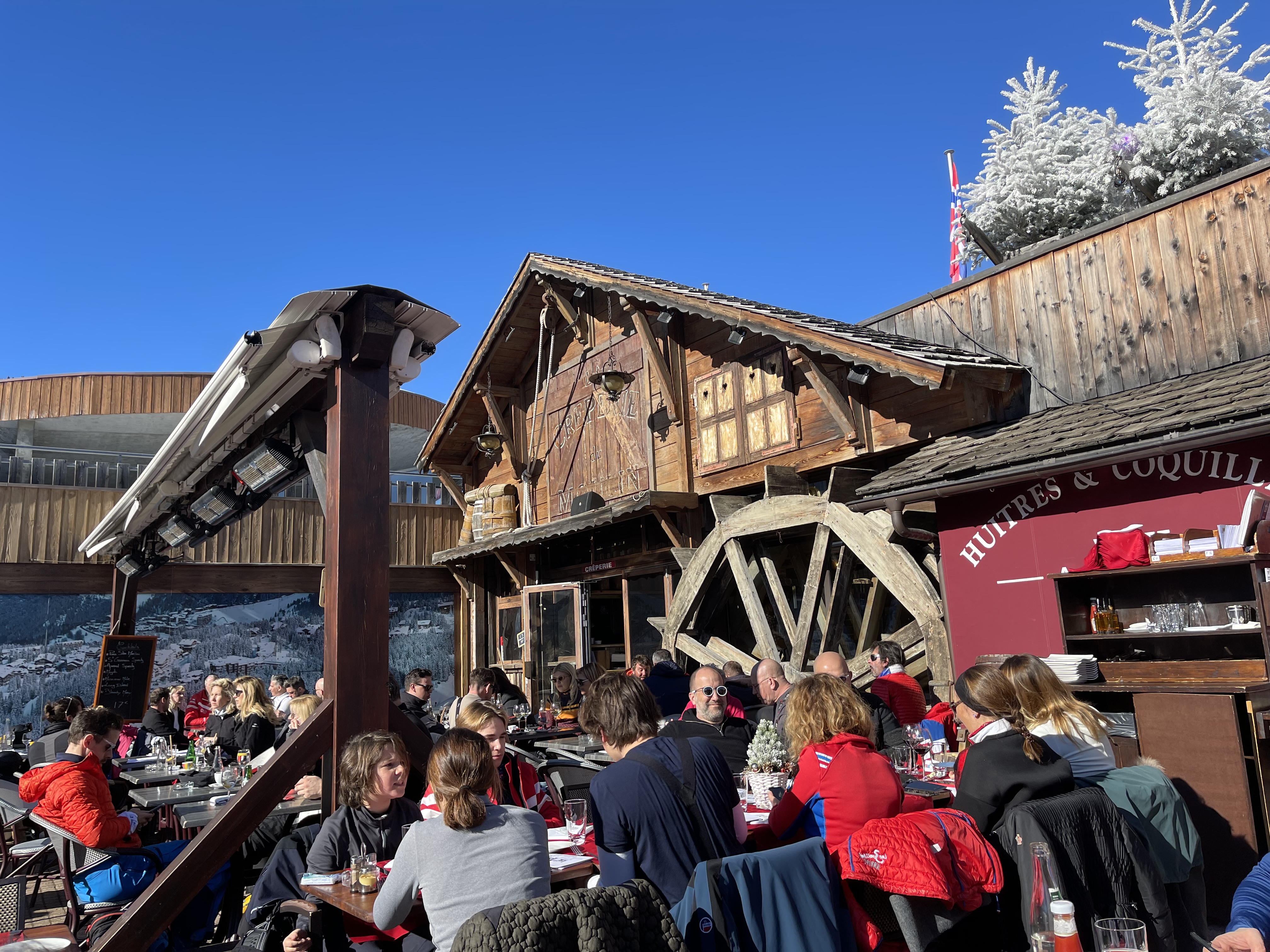 Laatste dag, laatste lunch. Sommige wilden nog één keer aan de castor burger in Méribel die we eerder in week al meermaals geslacht hadden, maar volgens Eddie was dat te ver weg, dus kozen we voor een fijne andere optie; lunchen in de mallemolen van Courchevel. Bediening in bont, louter glitter en glamour, en heel veel mensen die hun skies voor deze gelegenheid maar thuis gelaten hadden, we keken onze ogen uit!